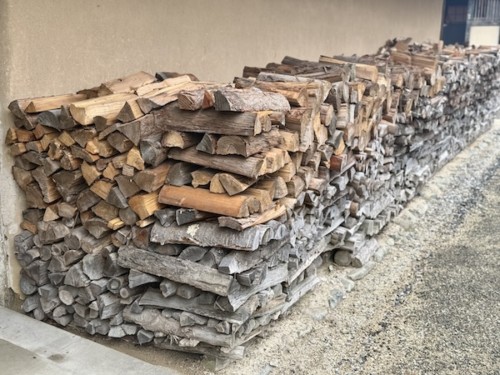 千鳥に組んだ薪が